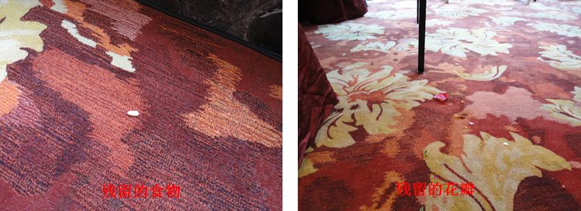 白云廳、羅浮廳、丹霞廳的窗簾有很嚴(yán)重的煙味和食物的味道,角落里有難聞的臭味, 廳內(nèi)揮發(fā)性氣體的味道很濃,其中丹霞廳的揮發(fā)性氣體的味道最為嚴(yán)重。