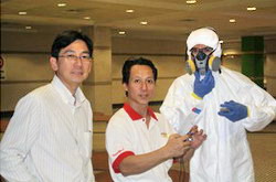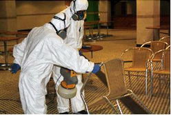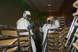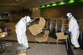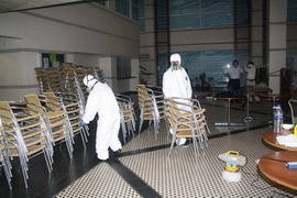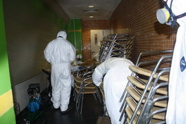 將需進(jìn)行霉菌處理的椅子集中在一個(gè)密閉的空間             工程人員全副武裝