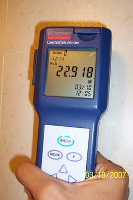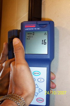 處理前表面細(xì)菌數(shù)采樣                    處理前測得表面細(xì)菌數(shù)為22918RLU