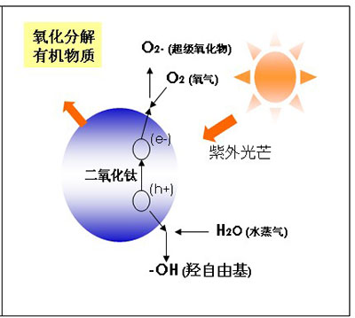 銀康光觸媒二氧化鈦工作原理: 光觸媒二氧化鈦在光照射條件下起作用,它能在室溫下分別與水蒸氣和氧氣發(fā)生反應(yīng)產(chǎn)生羥自由基和超級(jí)氧化物,而羥自由基和超級(jí)氧化物具有超強(qiáng)的氧化性,能氧化分解空氣中的有機(jī)物質(zhì),可使微生物體內(nèi)大分子的核酸、蛋白質(zhì)和DNA等發(fā)生過氧化反應(yīng),導(dǎo)致細(xì)胞直接損傷而死亡,最終將細(xì)菌氧化成CO2、H2O和微量無機(jī)鹽,達(dá)到消除微生物污染的目的。