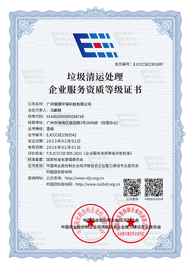 垃圾清運(yùn)處理企業(yè)服務(wù)資質(zhì)等級(jí)證書